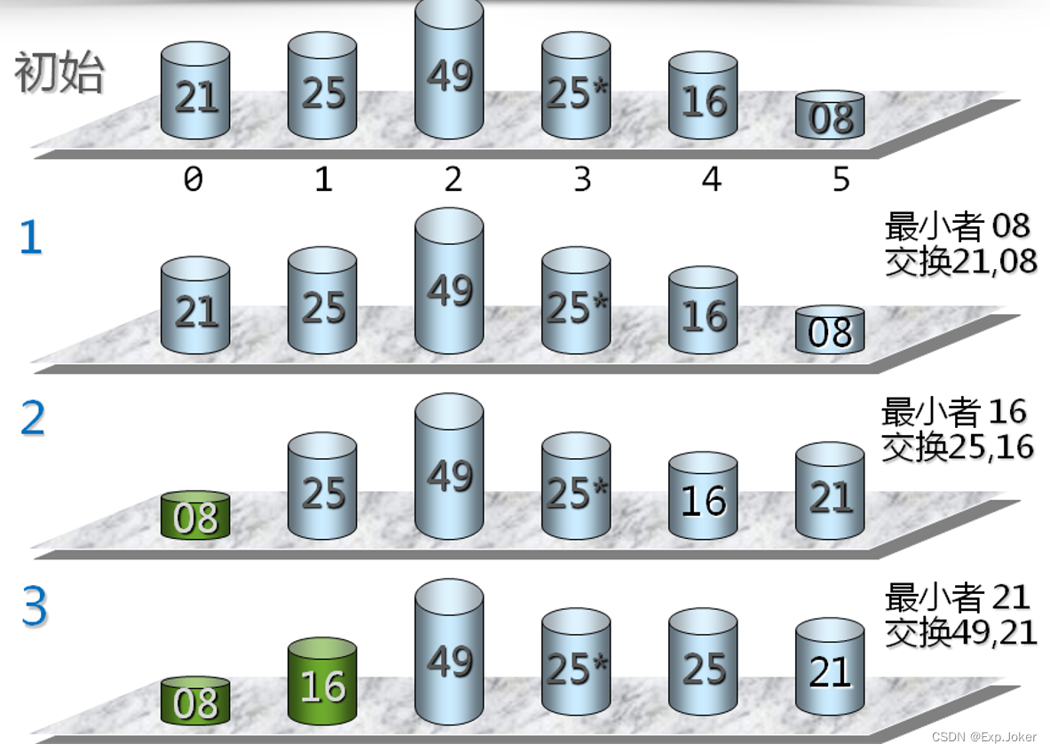 每次(例如第i次,i = 0,1,..., n-2)从后面n-i个待排的数据元素中选出关键字最小的元素,作为有序元素序列第i个元素。