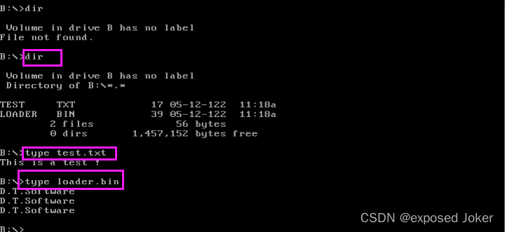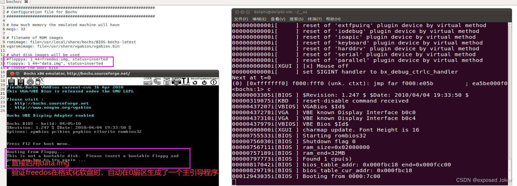 1. FreeDos中的format程序在格式化软盘的时候自动在第0扇区生成了一个主引导程序,这个主引导程序只打印一个字符串