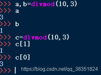(2)divmod(x,y)同时返回两个值,分别是x和y的整数商和除法余数,可以通过两个变量连续赋值的方式获得这两个值,也可以用一个变量保存这个值,并采用[]进行索引: