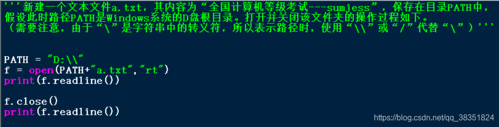 f.close()上述语句运行后将在D盘目录下覆盖生成文件a.txt,与之前内容相同。