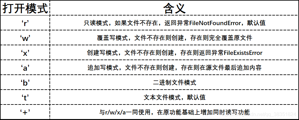 打开模式使用字符串的方式,表示字符串定义,单引号或者双引号均可。上述打开模式中,‘r’、‘w’、‘x’可以和‘b’、‘t’、‘+’组合使用,形成既表达读写又表达文件模式的方式。打开文件有一些常用组合,使用方法如下: