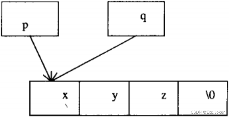 p和q现在是两个指向内存中同一地址的指针。这个赋值语句并没有同时复制内存中的字符。如下图: