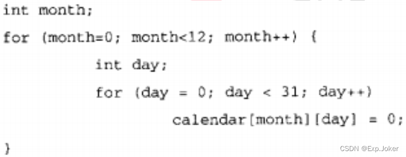 这个语句声明了calendar是一个数组,该数组拥有12个数组类型的元素,其中每个元素都是一个拥有31个整型元素的数组。