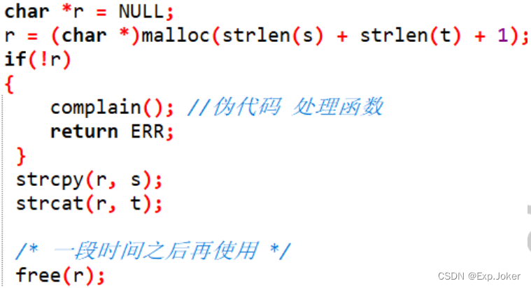 - 给r分配的内存在使用完之后应该及时释放(本例存储局部变量,及时释放);