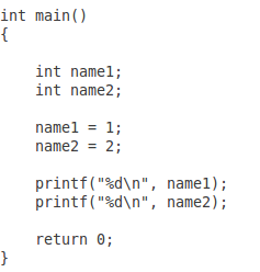 #include <stdio.h> #define NAME(n) name##n int main() { int NAME(1); int NAME(2); NAME(1) = 1; NAME(2) = 2; printf("%d\n", NAME(1)); printf("%d\n", NAME(2)); return 0; }