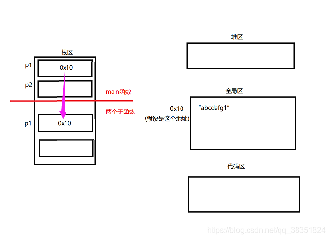 ④ 程序执行到 p1 = getStr1(); 由于个人原因在全局区中应该为“abcdefg1\0”
