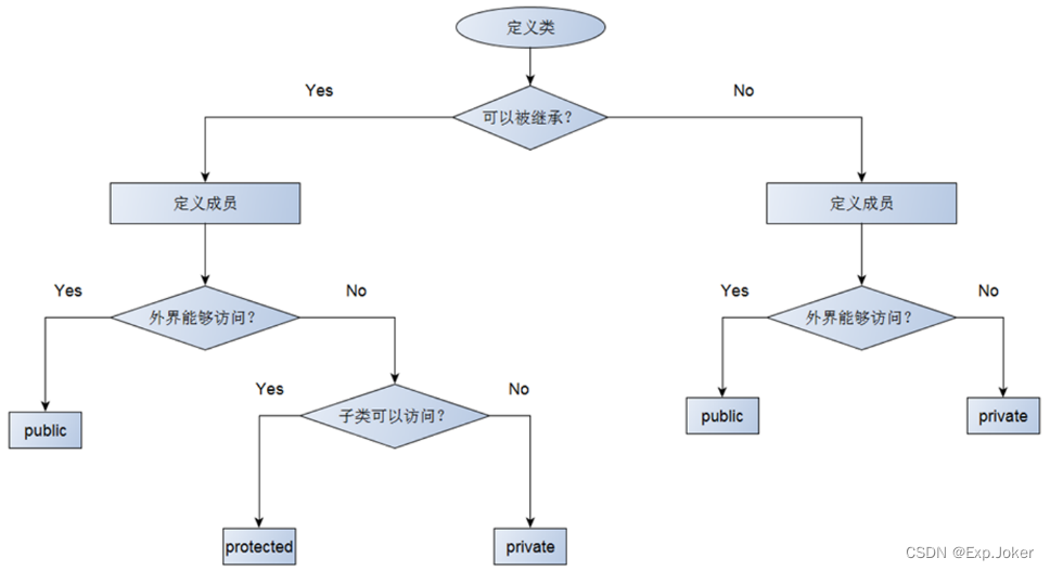 - 继承方式直接影响父类成员在子类中的访问属性