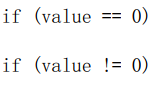 假设整型变量的名字为value,它与零值比较的标准if语句如下: