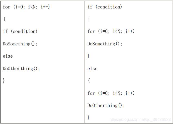 示例左的程序比示例右多执行了N-1次逻辑判断。并且由于前者老要进行逻辑判断,打断了循环“流水线”作业,使得编译器不能对循环进行优化处理,降低了效率。如果N非常大,最好采用示例右的写法,可以提高效率。如果N非常小,两者效率差别并不明显,采用示例左的写法比较好,因为程序更加简洁。