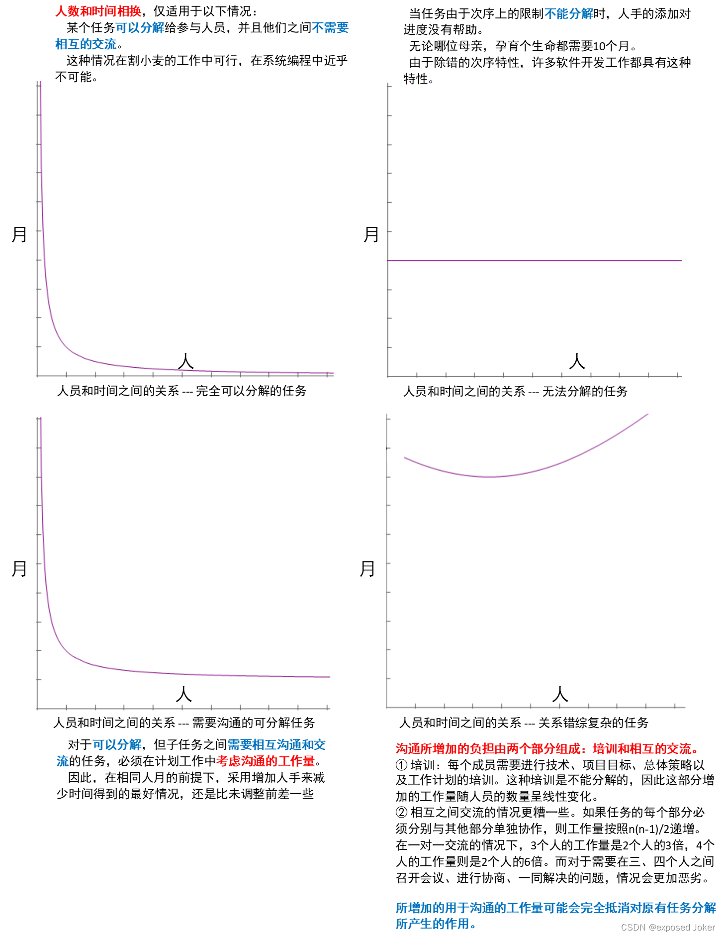 - 因为软件开发本质上是一项系统工作 --- 错综复杂关系下的一种实践,沟通、交流的工作量非常大,它很快会消耗任务分解所节省下来的个人时间。从而,添加更多的人手,实际上是延长了而不是缩短了时间进度。