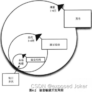 描述了敏捷项目主要的周期关系。根据项目的大小,理想的发布周期是几周到几个月。在每个增量开发周期里,应该使用短的迭代(不应该超过两周)。每个迭代都要有演示,选择可能提供反馈的用户,给他们每人一份最新的产品副本。