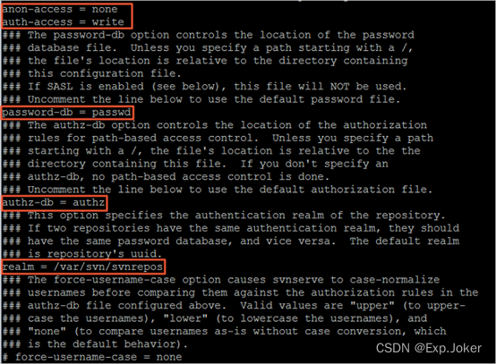 i. 运行vi svnserve.conf打开SVN服务配置文件。