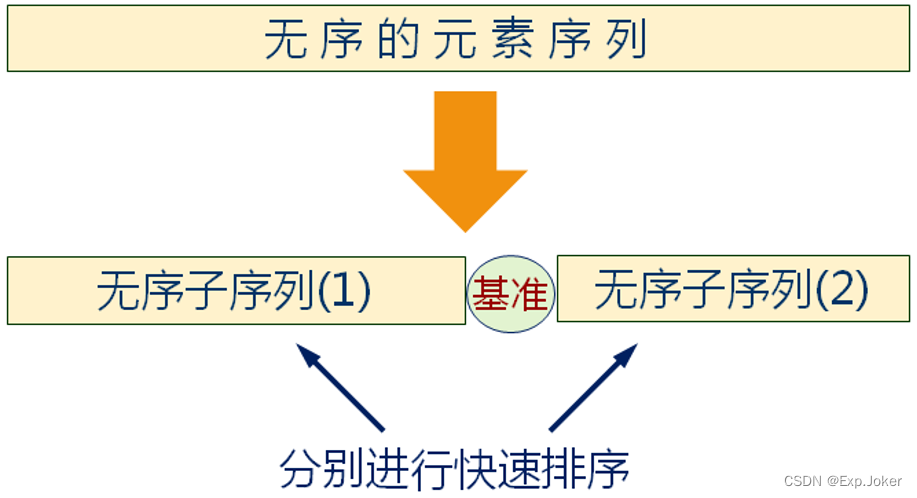 - 任取序列中的某个数据元素作为基准将整个序列划分为左右两个子序列