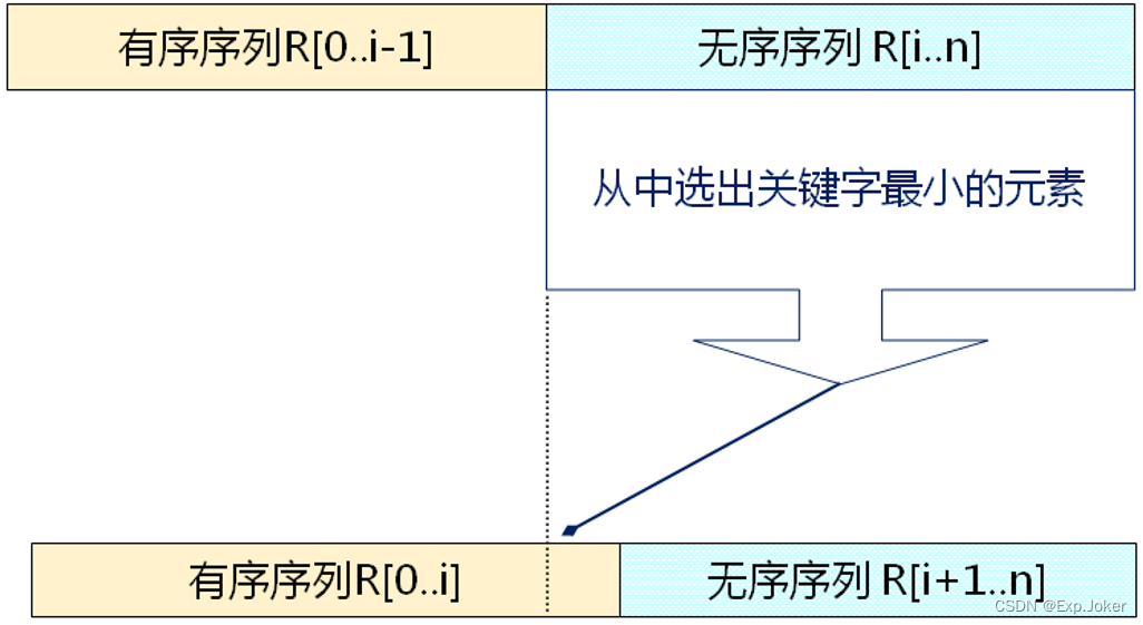 每次(例如第i次,i = 0,1,..., n-2)从后面n-i个待排的数据元素中选出关键字最小的元素,作为有序元素序列第i个元素。