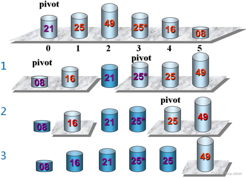 - 右侧子序列中所有元素都大于基准元素