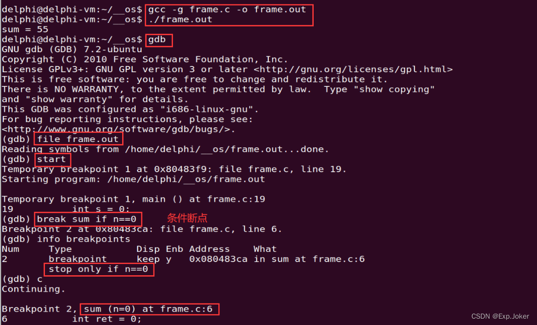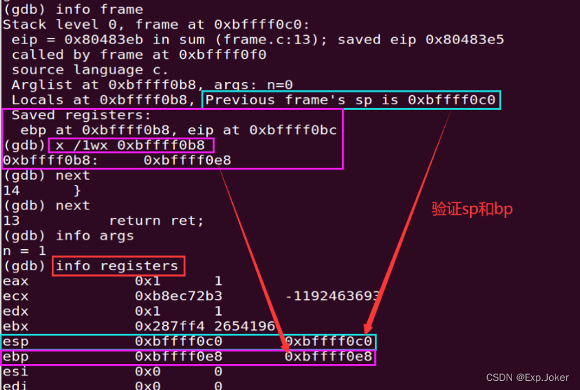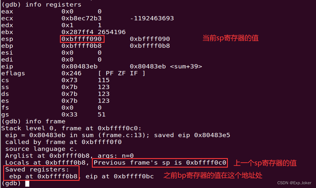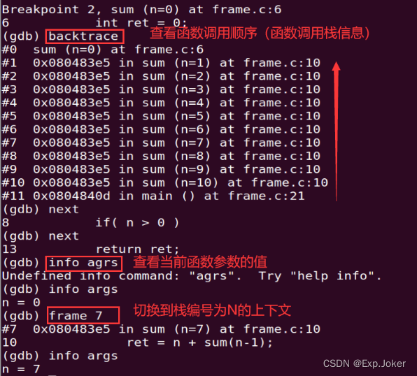 - GDB支持函数调用栈的查看(backtrace, info frames)