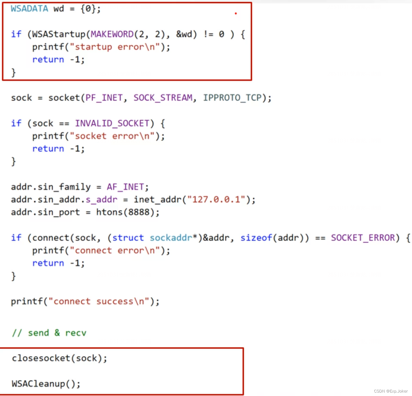 - connect(), send(), recv()错误返回SOCKET_ERROR(不可默认为-1)