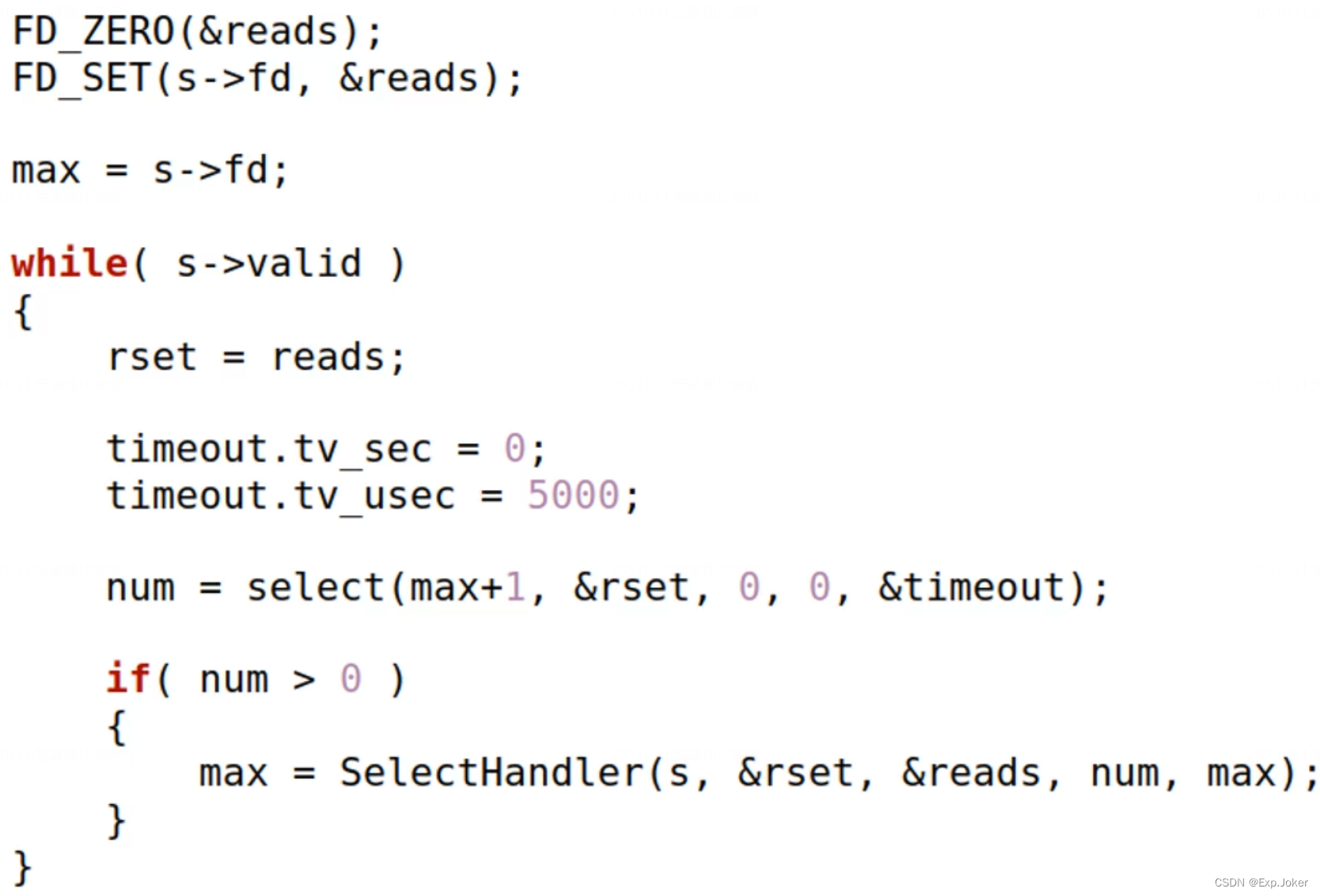 static int SelectHandler(Server* s, fd_set* rset, fd_set* reads, int num, int max)