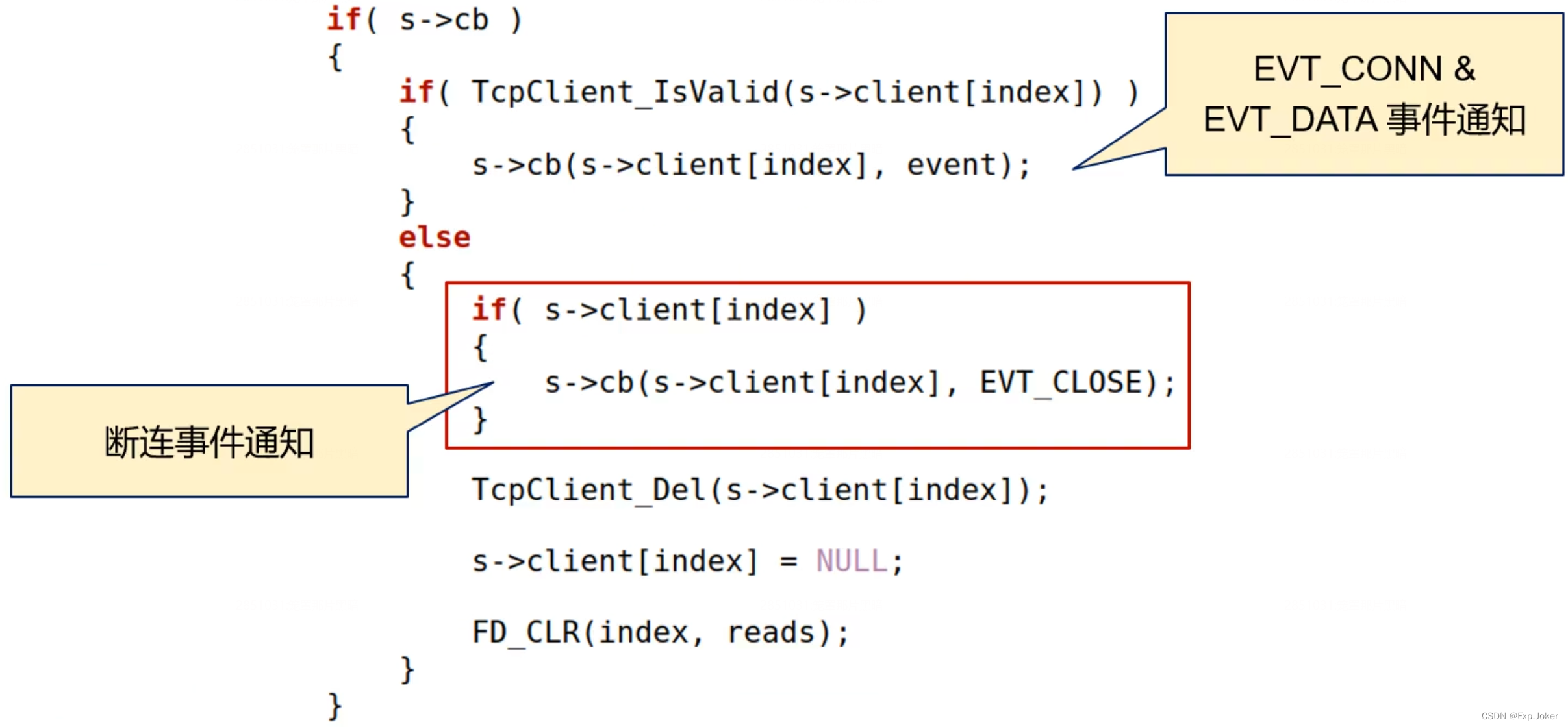 - 客户端断开服务端时触发,相关TcpClient将被销毁