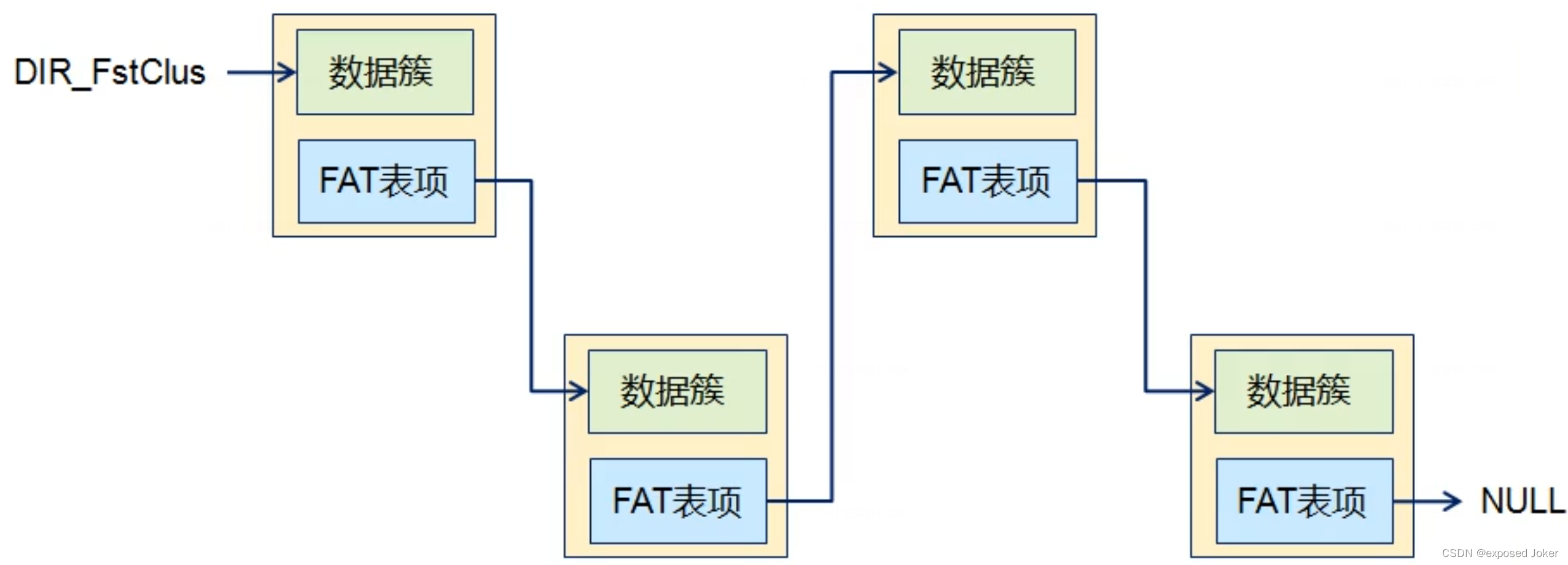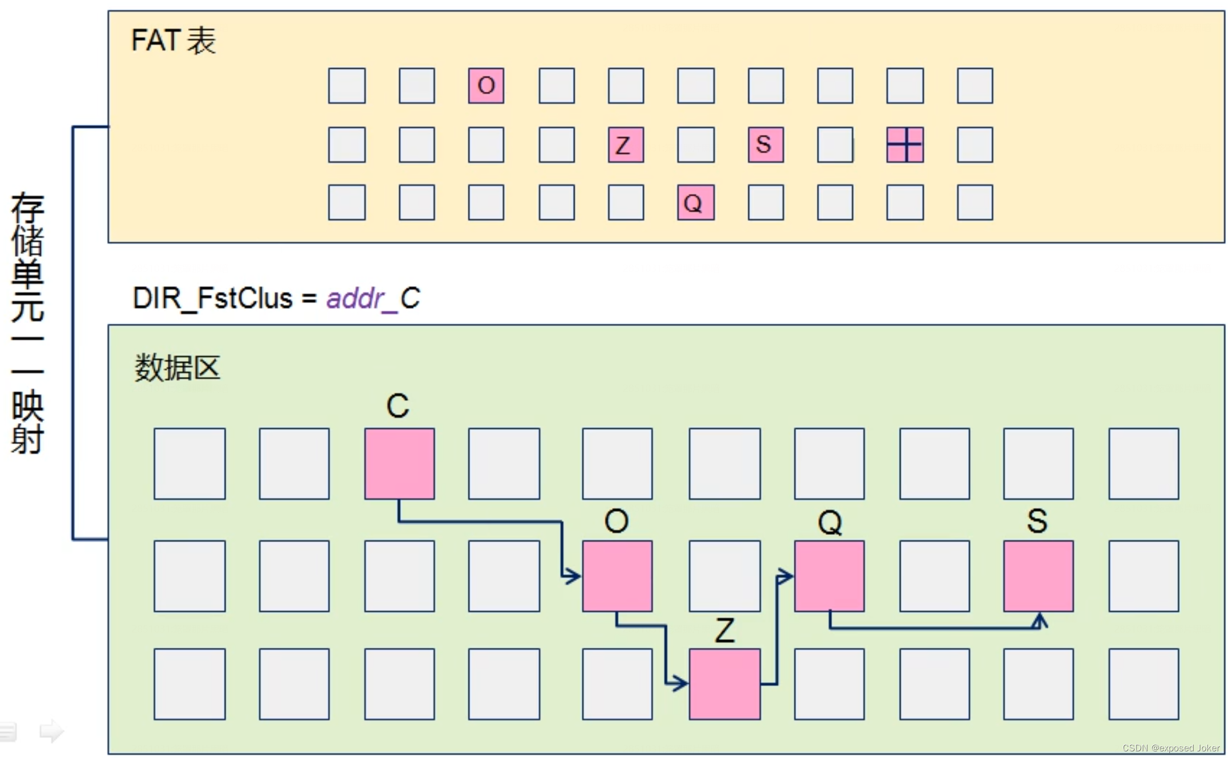 eg:首地址C的地址可以根据目录项获取,通过C地址数据簇所对应的FAT表项,拿到下一个数据簇O的地址。….直到结束符。