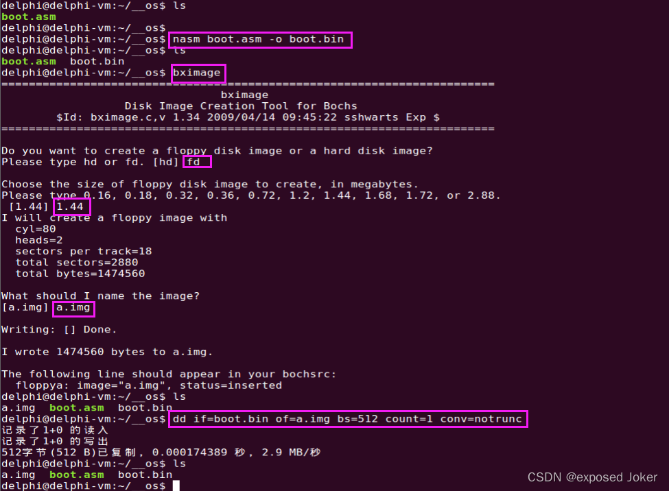 - dd if=boot.bin of=a.img bs=512 count=1 conv=notrunc