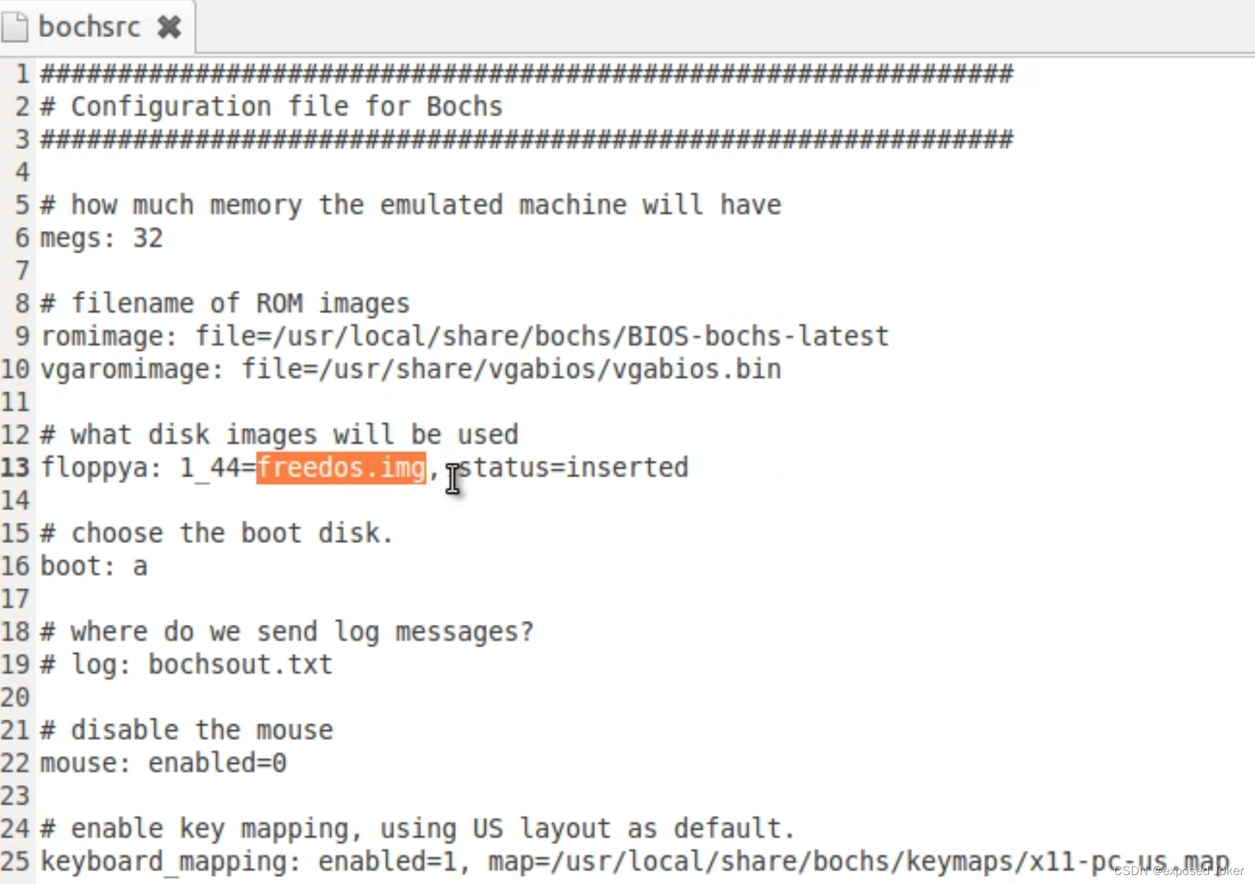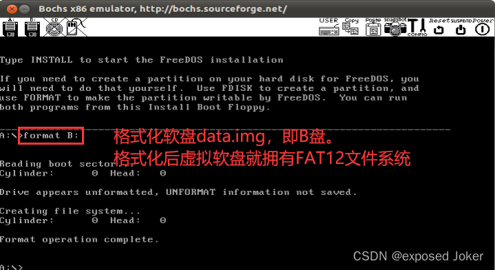 1. FreeDos中的format程序在格式化软盘的时候自动在第0扇区生成了一个主引导程序,这个主引导程序只打印一个字符串