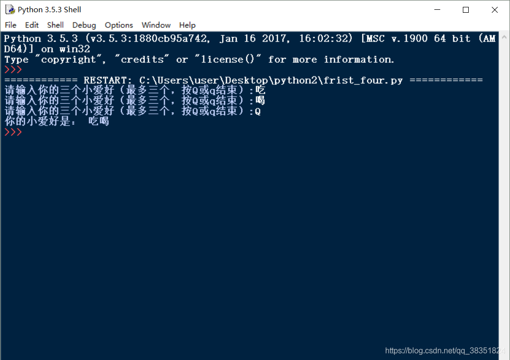 s = input('请输入你的三个小爱好(最多三个,按Q或q结束):')