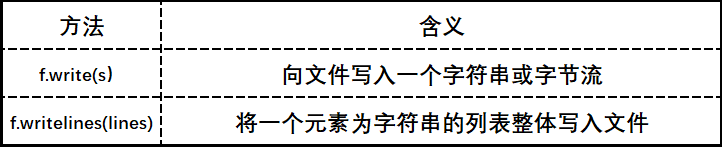 f.write(s)向文件写入字符串s,每次写入后,将会记录一个写入指针。该方法可以反复调用,在写入指针后分批写入内容,直至文件被关闭。