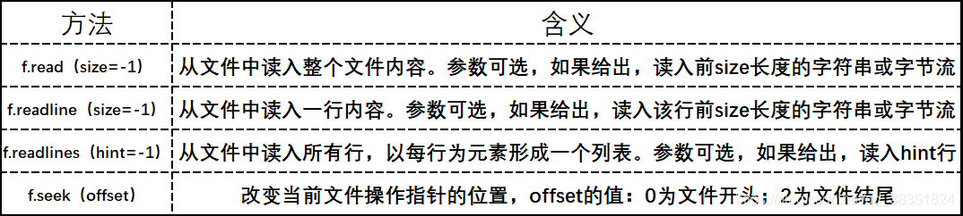 (4)f.seek()方法能够移动读取指针的位置,f.seek(0)将读取指针移动到文件开头。 f.seek(2)将读取指针移动到文件结尾。