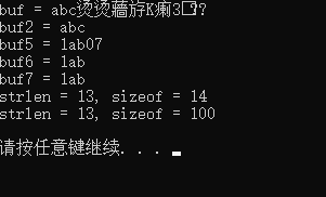 printf("strlen = %d, sizeof = %d\n", strlen(buf9), sizeof(buf9));