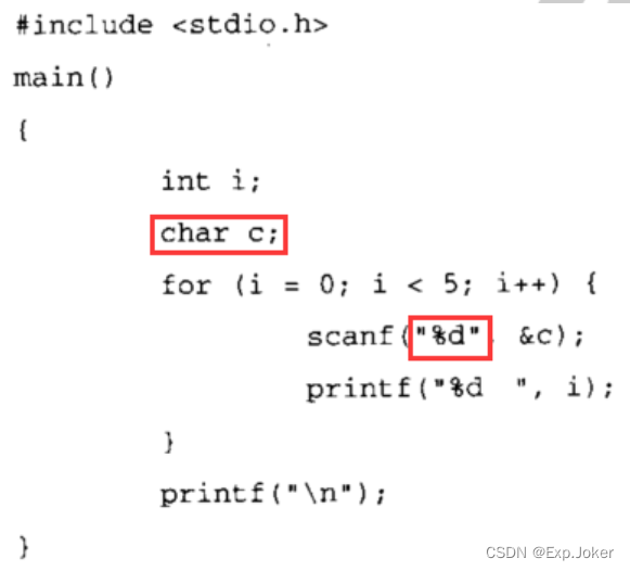 字符c附近的内存中存储的内容是由编译器决定的,本例中它存放的是整数i的低端部分。因此,每次读入一个数值到c时,都会将i的低端部分覆盖为0,而i的高端部分本来就是0,相当于i每次被重新设置为0,循环将一直进行。当到达文件的结束位置后,scanf函数不再试图读入新的数值到c。这时,i 才可以正常地递增,最后终止循环。