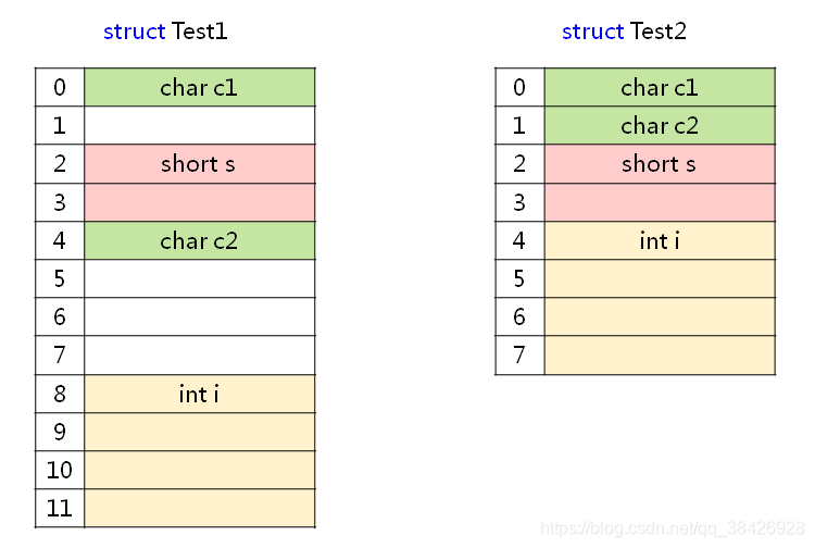 struct Test1 { char c1; short s; char c2; int i; }; struct Test2 { char c1; char c2; short s; int i; };写一段代码运行一下:
