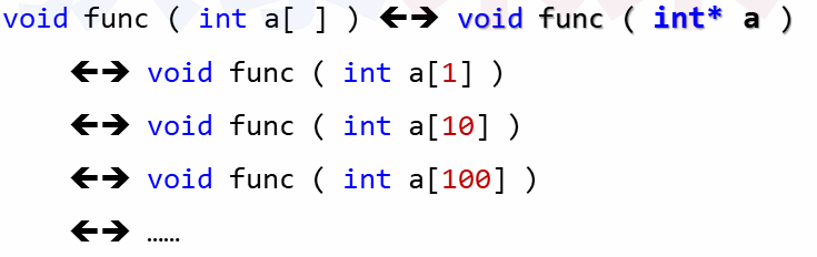 函数的数组形参退化为指针,因此,不包含数组实参的长度信息。使用数组名调用时,传递的是0号元素的地址。