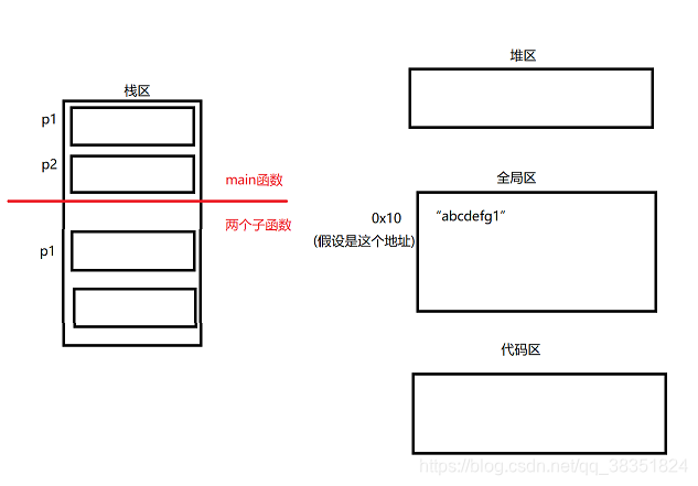 ⑤ 程序执行到 p2 = getStr2(); 由于个人原因在全局区中应该为“abcdefg1\0”
