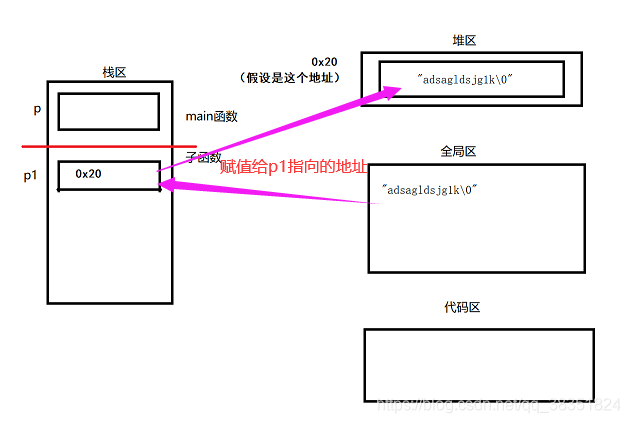 ④ 程序运行到 strcpy(p1,"adsagldsjg1k");