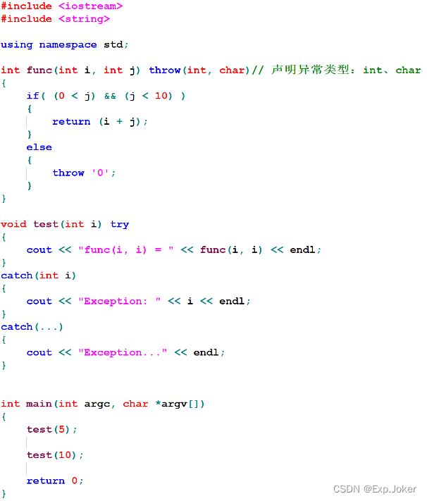- 异常声明作为函数声明的修饰符,写在参数列表后面