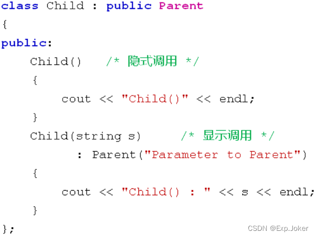 - 父类构造函数可以被隐式调用或者显示调用