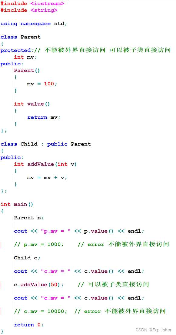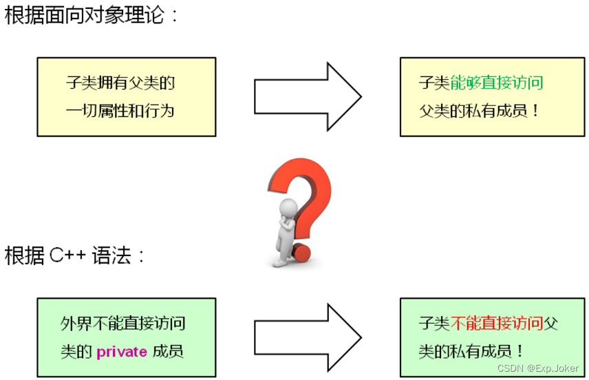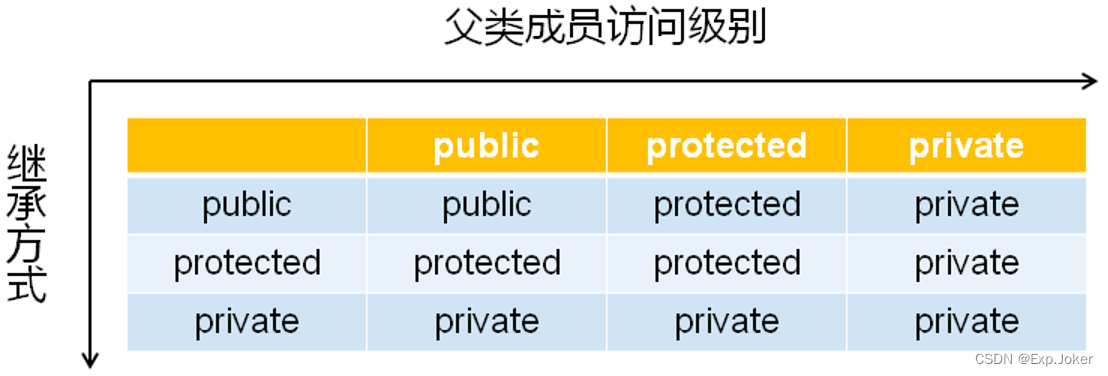 - 继承方式直接影响父类成员在子类中的访问属性