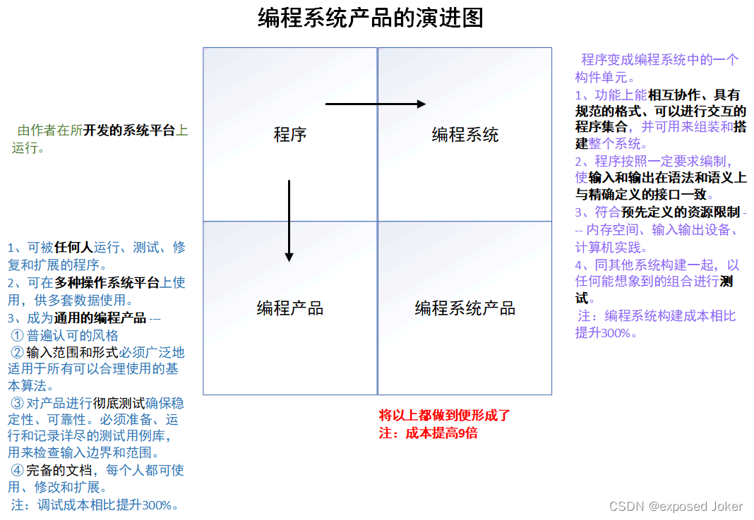 1.1 编程系统产品(Programming Systems Product)开发的工作量是供个人使用的、独立开发的构件程序的九倍。我估计软件构件产品化引起了 3 倍工作量,将软件构件整合成完整系统所需要的设计、集成和测试又强加了 3 倍的工作量,这些高成本的构件在根本上是相互独立的。