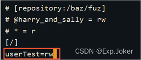 iii. 移动光标至文件末尾,并添加如下代码(其中,userTest表示账号,r表示读权限,w表示写权限):