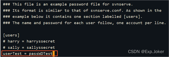 ④ 移动光标至[users]下,添加用户账号和密码。