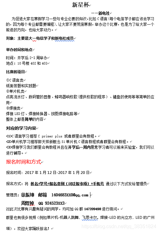在寒假之前,发现实验室有种种问题,改进了实验室安全制度,为了增加社团人气,特此举办第一届新星杯比赛。见下图: